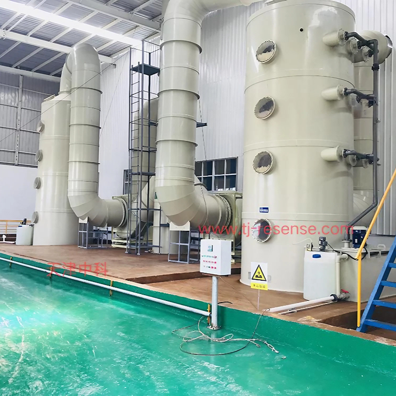 Un ventilateur en plastique renforcé de fibre de verre est utilisé pour diriger les vapeurs acides vers le système de traitement des vapeurs acides. Le système utilise une tour de lavage en PP (Polypropylène), qui peut être utilisée pour un traitement primaire ou améliorée pour un processus de traitement à deux niveaux.